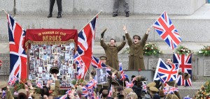 La protagonista e Lucy Davis ritratte durante una sequenza di festeggiamenti a Trafalgar Square