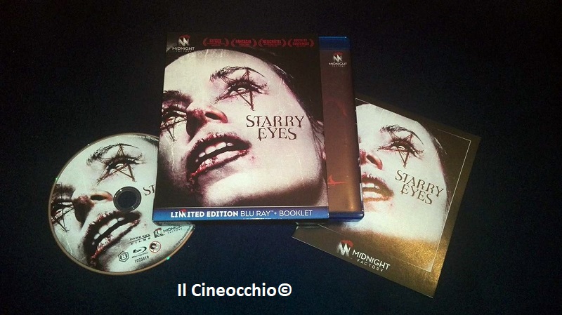 COMMENTO: Horror complesso e stratificato, ricco di simbolismo, è una variante del classico faustiano del ‘cosa sei disposta a fare per ottenere il successo (a Hollywood)’, l’acclamato Starry Eyes arriva finalmente dopo 4 anni anche sugli scaffali dei negozi italiani, andando a colmare una lacuna piuttosto pesante. Girato con una Red, il film presenta anche in blu-ray un’immagine quasi piatta, ai limiti del monocromatico, una scelta assolutamente voluta dai due registi (e aiutata dal meteo dei giorni di riprese). Alcuni colori certo spiccano, in particolare rosso e verde, perché questi assumeranno un significato speciale (e maggiore intensità) a un certo punto. Nonostante la mancanza di profondità, l’immagine è comunque nitida e dettagliata, sia nei primi piani che negli elementi secondari. Essendo Starry Eyes è raccontato interamente dal punto di vista di Sarah, il mix audio 5.1, codificato in DTS-HD MA (sia in italiano che nell’originale inglese), risulta soggettivo e non realistico, ‘tralasciando’ a volte molti effetti, altre invece alzando il volume di suoni specifici che Sarah trova spaventosi o inquietanti (vedere la scena della festa o la seconda audizione per la Astrae Pictures). I dialoghi sono sempre riprodotti chiaramente. La colonna sonora di Jonathan Snipes suona molto diversa da quella che i registi avevano immaginato inizialmente, ma che è stata poi accettata e apprezzata per il suo utilizzo di sintetizzatori e carillon, in tono con l’aria spettrale del film. Terminando con i contenuti speciali, troviamo oltre al booklet di 8 pagine e al trailer, una galleria fotografica, alcune scene tagliate (11′), il provino di Alex Essoe (14′) e la featurette Dalla musica al film (3′).