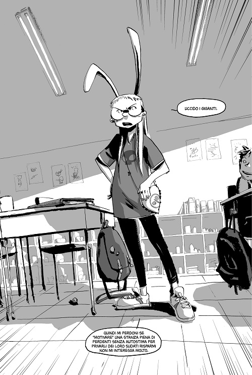 Andando con ordine, partiamo con il toccante I Kill Giants – capace di tingere la quotidianità di fantastico, regalando al lettore una lunga storia sospesa tra due mondi, sull’orlo di un baratro fatto di dolore e incertezza -, che ritorna nelle fumetterie in una edizione che si può tranquillamente indicare come definitiva (240 pagine), cartonata e con una nuova copertina che richiama il recente film diretto da Anders Walter e interpretato da Madison Wolfe e Zoe Saldana, disponibile da qualche mese nel catalogo Netflix (la nostra recensione). Punto forte sono sicuramente i nuovi ‘contenuti speciali’ in chiusura, che non solo racchiudono ampi stralci della sceneggiatura, ma raccontatano la nascita dei protagonisti e i relativi percorsi che hanno portato al loro design finale.
