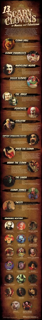 Alcune persone sono completamente terrorizzate dai clown (il termine tecnico è coulrofobia) ed è facile capirne il perché. I pagliacci possono essere incredibilmente inquietanti, ma è anche quello che ci piace di loro! Il sito Halloween Costumes ha ora realizzato una divertente infografica che descrive 13 dei clown più spaventosi mai apparsi al cinema e in TV dal 1982, facendo un grande lavoro nel ricordarci di tutti i pagliacci psicopatici che hanno infestato i nostri incubi da allora. Hanno anche inserito una lista con le menzione d’onore.