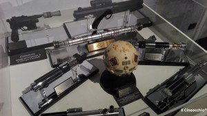 Attraversando una tenda, si entra quindi nel vivo dell’esposizione e ci si trova davanti a una parete ricoperta dagli albi originali dei fumetti di Star Wars, su cui spicca il primo numero pubblicato dalla Marvel nel 1977, sulla cui copertina compaiono i protagonisti, ben diversi da quelli che poi sarebbero arrivati sul grande schermo (c’è anche un coniglio verde di nome Jaxxon…). Pochi passi più in là c’è una sezione dedicata al Lato Oscuro: dal costume integrale di Darth Vader e dalle prime prove del suo casco (ispirato a quello dei samurai visti da Lucas nei film di Akira Kurosawa), all’Imperatore, a Darth Maul, il Conte Dooku e all’ultimo arrivato, Kylo Ren. Procedendo ci si imbatte nelle riproduzioni a grandezza naturale di R2D2 (o C1-P8) e C-3PO. Più avanti si incrociano due teche, la prima che racchiude le spade laser e le altre armi usate nei film, la seconda che mette in mostra i celebri caschi degli Stormtroopers. In un angolo troviamo anche l’armatura del cacciatore di taglie Boba Fett (autografata da Jeremy Bulloch), a guardia di un Han Solo imprigionato nella grafite.